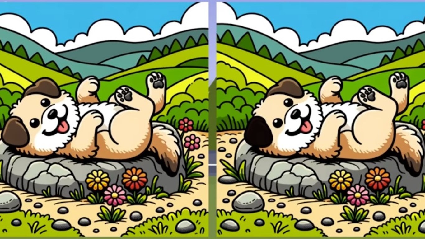 На майже однакових картинках зображено веселого песика, який бавиться на камені. Між малюнками є три непомітні відмінності, які потрібно знайти за 12 секунд.