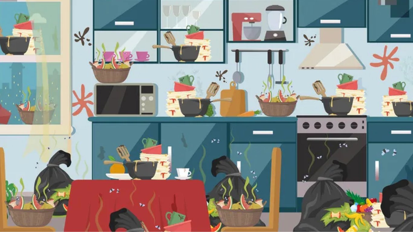 У цьому помешканні точно живе нечупара: плями на стінах, брудні тарілки та каструлі, зіпсована та гнила їжа, переповнені мішки для сміття. Дивлячись на цю занедбану страшну кухню, апетит точно пропаде.