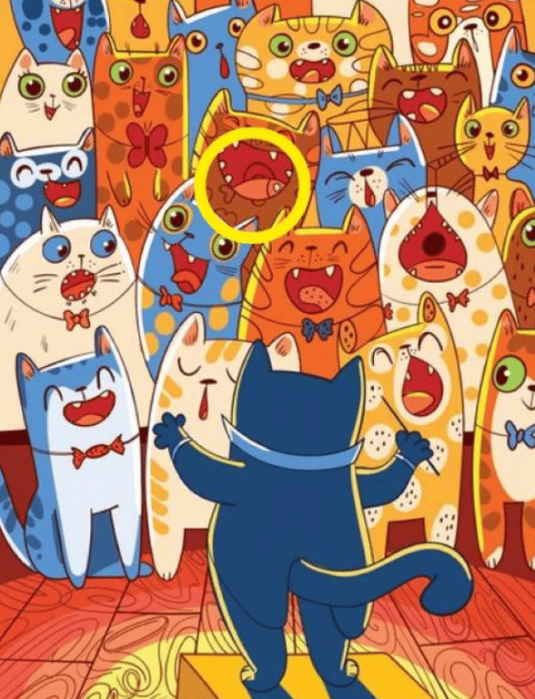 Подивіться уважно на одного з котів, який весело співає у хорі поруч зі своїми друзями, а саме — на коричневу тварину посередині. Саме цей кіт з’їв рибку перед тим, як співати. В його роті і можна знайти рибку, яку одразу важко помітити.