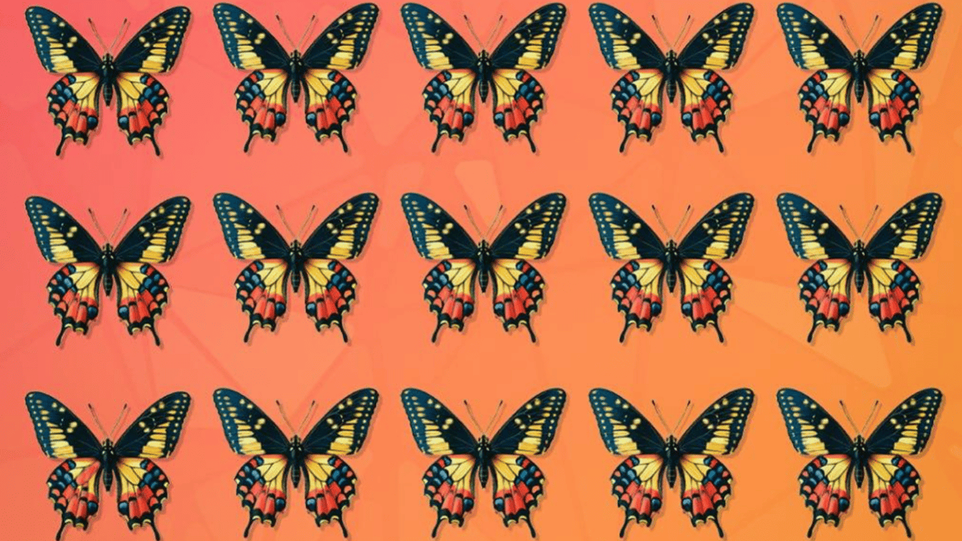 Перед вами картинка, на якій зображена невелика кількість неймовірної краси метеликів. Всі вони є однаковими, але серед них є той метелик, який не такий, як всі. Спробуйте відшукати цього унікального метелика, але на цю задачу вам дається лише десять секунд.