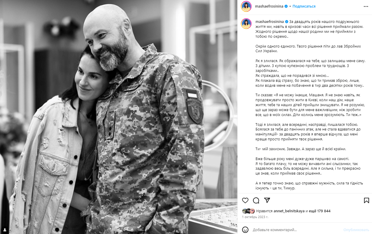 Нещодавно Маша розповіла, як Тимур прийняв рішення вступити до лав ЗСУ, не спитавши у неї про це. Ведуча зазначила, що тоді вона дуже злилася і ображалася на нього через те, що він залишає її саму з дітьми і багатьма проблемами.