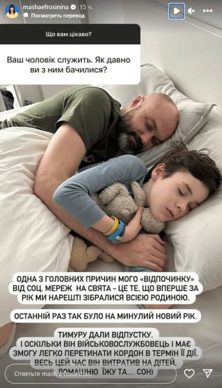 "Одна з головних причин мого "відпочинку" від соцмереж на свята — це те, що вперше за рік ми нарешті зібралися всією сім’єю. Останній раз так було на минулий Новий рік. Тимуру дали відпустку. Оскільки він військовослужбовець і має змогу легко перетинати кордон у термін її дії. Весь цей час він витратив на дітей, домашню їжу і сон", — пояснила Маша Єфросініна.