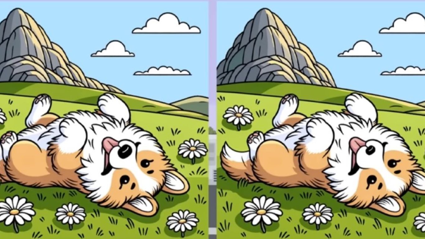 На почти одинаковых картинках изображен веселый песик на лужайке. Между рисунками есть три незаметных отличия, которые нужно искать на животном, цветах, лужайке, горах, небе и склонах.