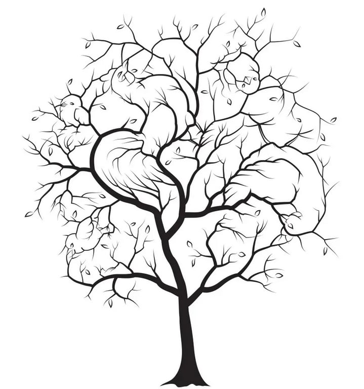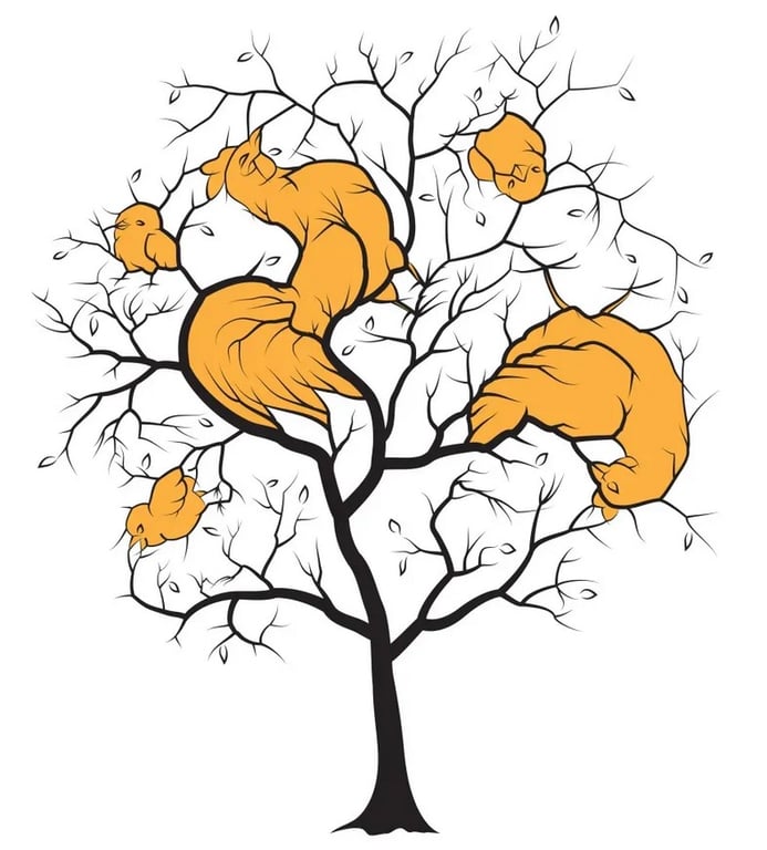 На этом рисунке изображен эскиз ветвей и листьев дерева на белом фоне. Монохромная оптическая иллюзия ставит перед игроками задачу найти пять животных.