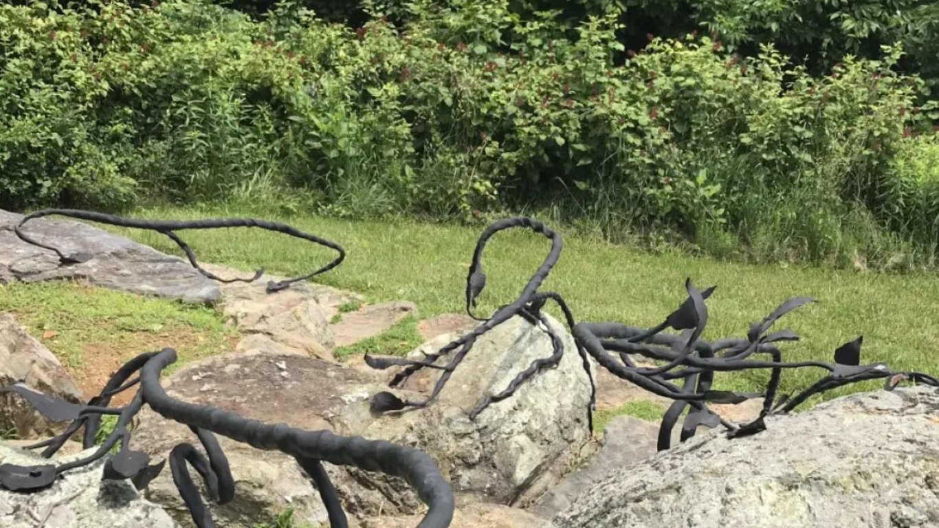 Сначала трудно заметить что-нибудь, кроме большой скульптуры с длинными черными виноградными лозами и цветами над большими валунами.