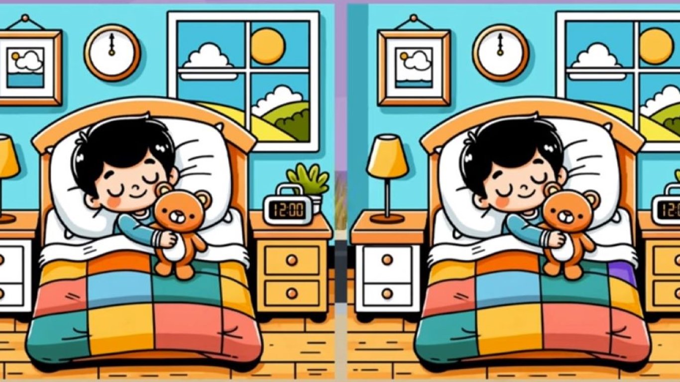 Спальня мальчика, который видит сладкие сны обнявшись с игрушечным мишкой. Найдите три существенных отличия между почти одинаковыми рисунками за 12 секунд.