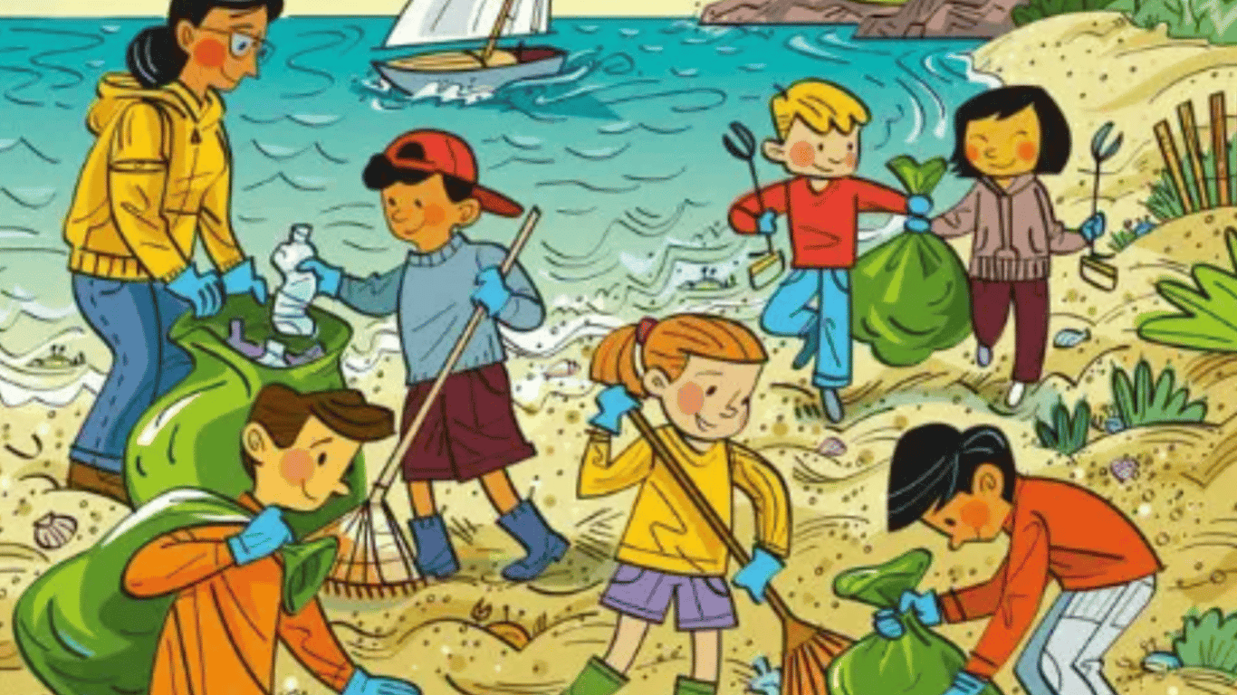 На малюнку зображено вісім школярів, які з радістю прибирають пляж біля моря, і вчителька, яка їм допомагає. Всі вони збирають сміття у великі пакети, щоб потім вивезти його у відповідні місця. Але в одного зі школярів є інструмент, який є дуже небезпечним для дітей.