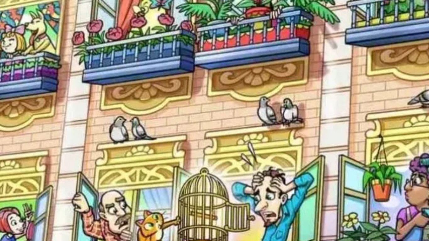 Господар засмучений, кіт у розпачі, адже з клітки, яку винесли на гарний балкон будинку старовинної забудови, зник папуга. Знайдіть втікача за 10 секунд на цьому переповненому сюжетами, подіями та деталями малюнку.