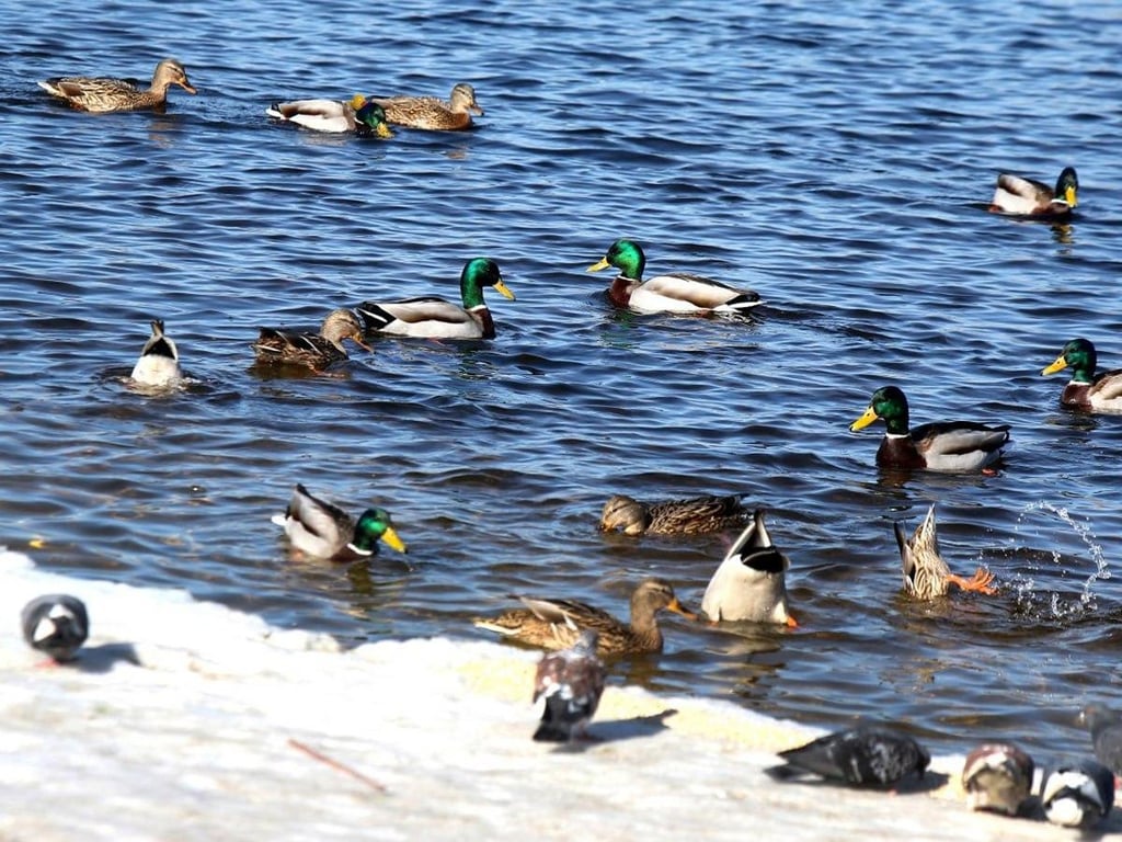 Подивіться уважно на фотографію, на якій можна помітити багато різних качок. Всі вони плавають у водоймі та насолоджуються теплом, а біля них на суші можна побачити у голубів. Мабуть, дивлячись на цей знімок у вас виникне відчуття, що ви також хочете поплавати просто зараз.