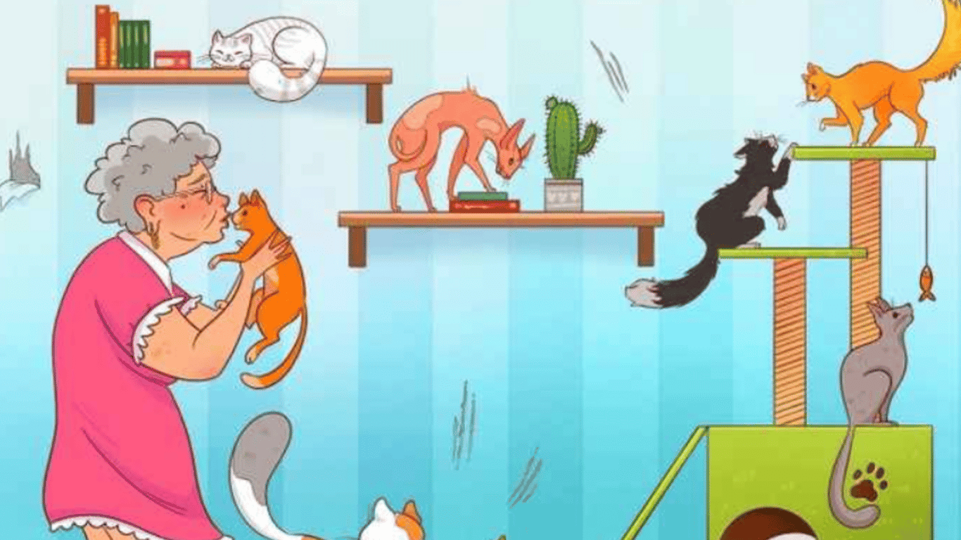 Отже, перед вами малюнок, на якому зображена літня жінка і дев’ять котиків. Жінка тримає на руках милого руденького котика, а всі інші роблять те, що їм заманеться — одні сплять, інші граються, а хтось бешкетує. Але, судячи з посмішки жінки, вона дуже щаслива мати цих котиків.