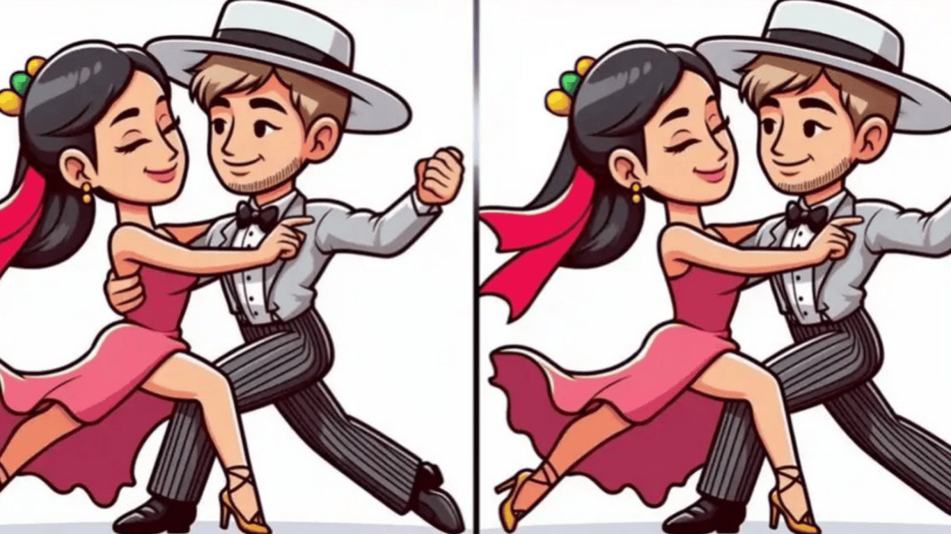Уважно подивіться на жінку, яка танцює з хлопцем, і зверніть увагу саме на її образ. Друга картинка відрізняється від першої тим, що на другому зображенні у жінки інакше вкладене волосся і по-іншому розвивається сукня в танці.