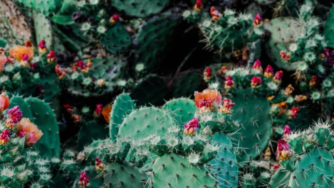 На фотографії зображені, здавалося б, нескінченні квітучі кактуси. Але серед зелені ховається кіт. Якщо знати, де шукати, то його не помітити дуже складно.